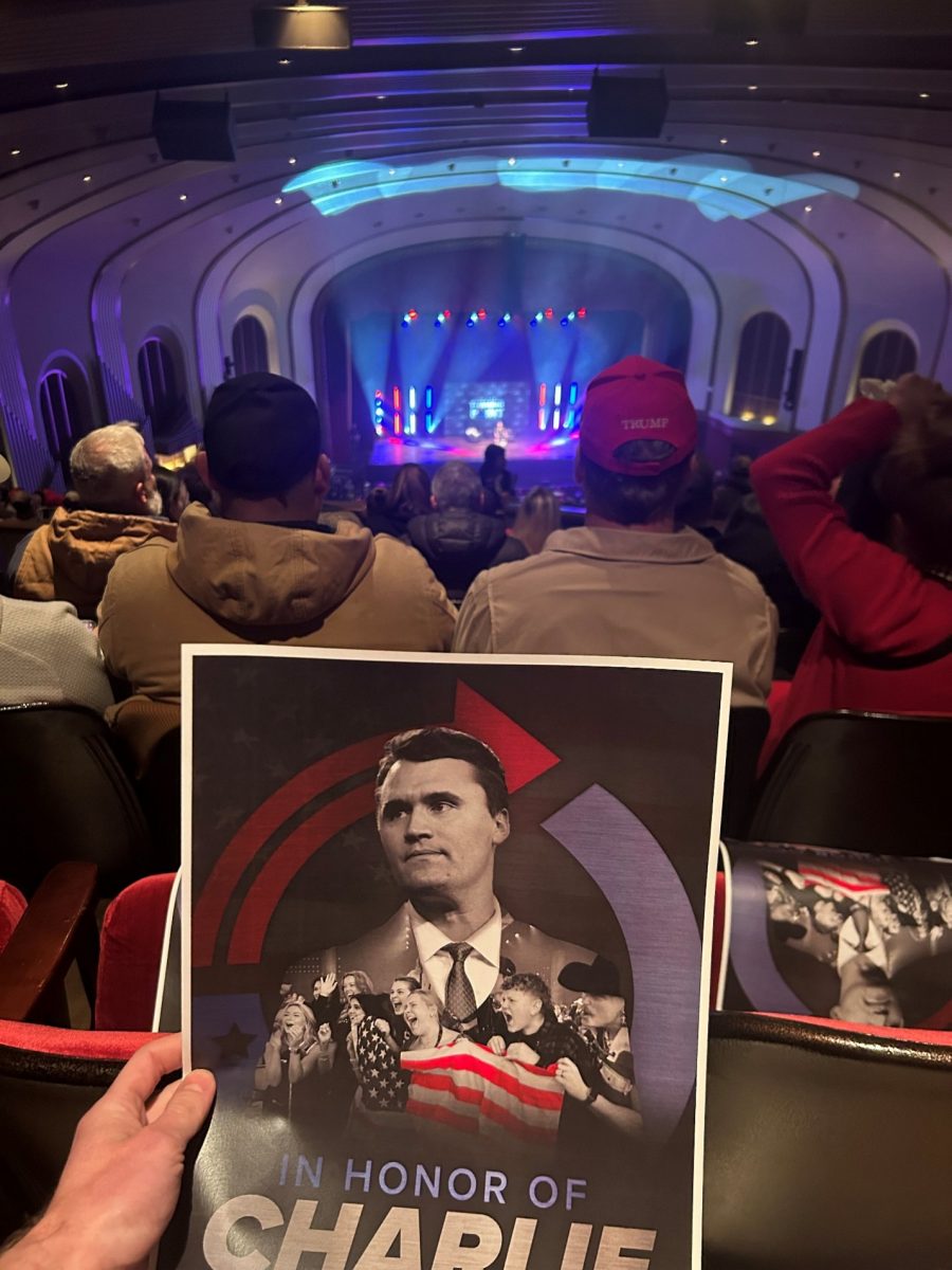 The IU Auditorium hosted the event and easily filled the seats across two levels. The modern rock architecture towered above the lines outside. Once the event began, the raucous crowd cheered after nearly every statement by the speakers. Three speakers, all associated with TPUSA, gave short speeches before Carlson was announced. Once Carlson walked on stage, attendees who wished to ask questions formed a line to ask the guest speaker opinionated questions regarding hot topics in American culture.